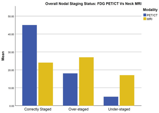 Among all patients, [18F]FDG PET/CT achieved correct nodal staging in 45 patients, whereas MRI achieved correct staging in 24 patients. In terms of histopathology, there were 18 cases upstaged by PET/CT compared to 27 cases in MRI, whereas understaging occurred in 5 cases in PET/CT compared to 17 cases in MRI (Figure 3).