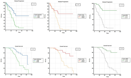 Tumor SUVmax, tumor MTV, and tumor TLG were also significantly correlated with OS and PFS (p < 0.01 each) (Figure 4).