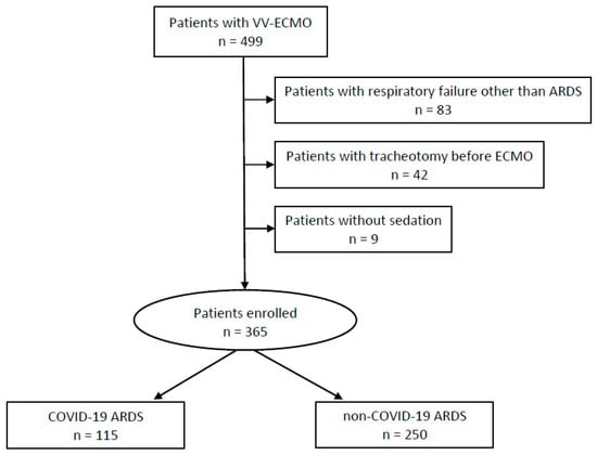 All adult patients (≥18 years old) with a polymerase chain reaction (PCR)-confirmed SARS-CoV-2 infection as the principal cause of severe ARDS with the need for VV-ECMO were included in the study (C-ARDS group). All patients were treated at our Department of Intensive Care Medicine between March 2020 and April 2022. The control group included patients with severe non-C-ARDS on VV-ECMO who were treated at the same department between the years 2009 and 2020. The sub-classification of non-C-ARDS included three categories: bacterial pneumonia, influenza-related pneumonia and other causes. Patients with veno-arterial ECMO or cardiac etiology of respiratory failure were excluded. The observational period started on the day of VV-ECMO implantation or on the day of admission to our department in case of cannulation at a referring hospital and simultaneous invasive mechanical ventilation via endotracheal tube. The observational period ended at the time of tracheotomy, explantation of VV-ECMO or death, depending on which event occurred first. Patients who were awake during VV-ECMO support, patients with tracheotomy before cannulation for VV-ECMO and patients with causes of respiratory failure other than ARDS were excluded from the study due to the different analgosedation regimes (Figure 1).
