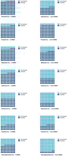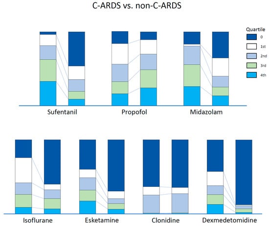 Determining optimal sedation strategies remains a challenge in the treatment of ARDS and may be even more demanding in patients requiring ECMO [,]. Data on sedation requirements in patients with C-ARDS are conflicting. While Flinspach et al. found evidence for higher needs in C-ARDS during ECMO, the results from Sigala et al. suggest a differential pattern with a higher demand for dexmedetomidine but a reduced dosing requirement for propofol compared with non-C-ARDS [,]. Similarly, we found both higher doses of single substances, midazolam and sufentanil, and an overall increased demand for sedative agents in patients with C-ARDS compared with patients with non-C-ARDS. Importantly, we observed a distinct preference for anesthetic agents depending on ARDS etiology. A higher proportion of patients with C-ARDS received midazolam, isoflurane, esketamine and dexmedetomidine compared with patients with non-C-ARDS. In contrast, more patients with non-C-ARDS were administered propofol (Figure 2).