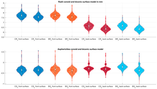 Table 2 lists the explorative data for the radii of curvature and the asphericity in the flat (X) and the steep (Y) meridian for a conoid and biconic surface fitted to the corneal front and back surface data of the Casia2. With the conoid fit, both asphericities are linked together due to the definition of the quadric surface, whereas for the biconic fit, the radii of curvature and asphericities in both principal meridians were fitted independently. Figure 2 displays the data scatter and the distributions of the radii of curvature and the asphericity in the flat (X) and steep (Y) meridian for the conoid and biconic model surface fitted to the measurement data. We can see directly from the plot that the radii of curvature at the corneal front surface are much larger as compared to the radii of curvature at the corneal back surface with both surface models but that there is no systematic difference between the asphericities for the corneal front and back surface or between the flat and steep meridian of both surface models.