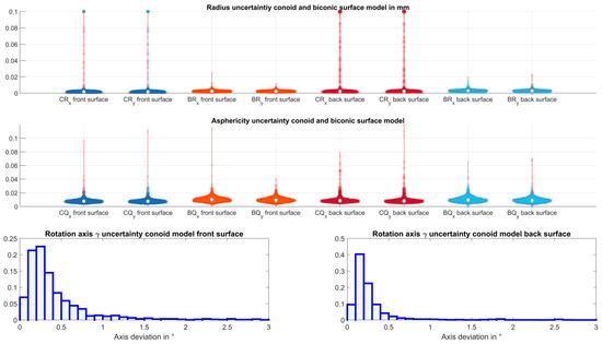 Table 3 gives an overview of the explorative data for the uncertainties of the surface parameters using bootstrapping. Using a sequence of 100 bootstraps of the fit error, the variation of both surface models fitted to the corneal front and back surface data was evaluated as the width of the 90% confidence interval. We can see from the Table that the uncertainty of the radii of curvature extracted from the conoid fit shows a mean variation of around 3 µm/7 µm for the corneal front/back surface and, correspondingly, around 2.5 µm/3 µm for the radii of curvature extracted from the biconic fit. However, if the 95% quantile is considered, the uncertainty in the radii extracted from the conoid increases to around 50 µm for the front surface fit and 1/10 of an mm for the back surface fit. For the radii extracted from the biconic surface fit, the respective values for the corneal front/back surface increase to around 40 µm/50 µm. Figure 3 shows the data spread and distributions of the uncertainties of the bootstrapped radii of curvature (upper graph) and asphericities (middle graph) for the conoid and the biconic surface model fitted to the corneal front and back surface data. From the distributions, we find that there might be some extreme values and outliers where the surface fit with a conoid or biconic is not really stable. The lower graph shows the uncertainty of the orientation of the flat axis of the conoid. From this graph, we can see that the axis can be extracted from the conoid model with high reproducibility, with the variation between the bootstraps in a range of up to 3°.