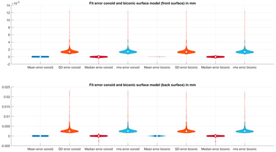 Violin plot showing the data spread, distribution, mean, median, and 90% confidence intervals of the mean, standard deviation (SD), median, and root mean squared fit error for the corneal front surface (upper plot) and the corneal back surface (lower plot). The fit error for the conoid surface fit/biconic surface fit is displayed on the left side/right side.