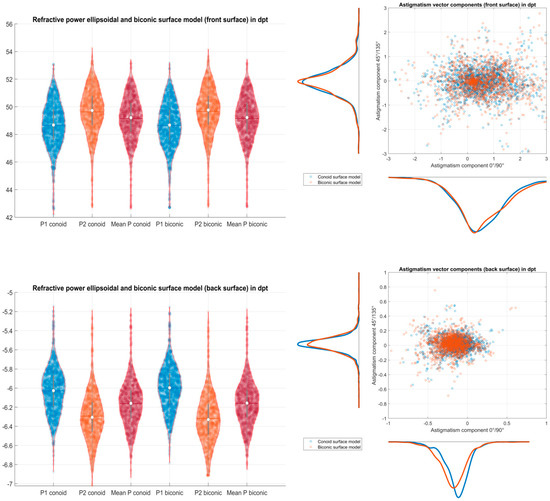 Refractive power derived from the radius of curvature data from the conoid and biconic fits the corneal front and back surface. Based on the refractive indices for air, cornea, and aqueous humour from the Liou–Brennan schematic model eye, the power of the corneal front surface (upper left graph) and the corneal back surface (lower left graph) is shown for the flat meridian (X), the steep meridian (Y), and the mean power with violin plots. The decomposition of astigmatism into vector components (double angle plot) is displayed for both surface models for the corneal front surface (upper right graph) and the corneal back surface (lower right graph) with scatterhistograms.