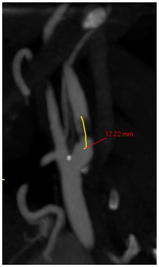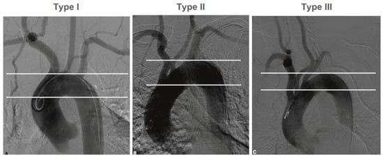 - Suh, G.-Y.; Beygui, R.E.; Fleischmann, D.; Cheng, C.P. Aortic Arch Vessel Geometries and Deformations in Patients with Thoracic Aortic Aneurysms and Dissections. J. Vasc. Interv. Radiol. 2014, 25, 1903–1911. [Google Scholar] [CrossRef]