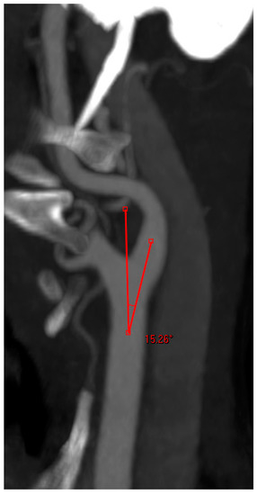 - Angle between the CCA and the ICA: measured on the treated side only. At the carotid bifurcation, one arm of the angle was placed along the central axis of the CCA and the other arm was drawn into the central axis of the ACI. The cranial angle was measured (Figure 4);