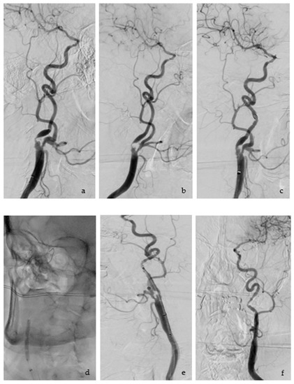 - Doig, D.; Hobson, B.; Müller, M.; Jäger, H.; Featherstone, R.; Brown, M.; Bonati, L.; Richards, T. Carotid Anatomy Does Not Predict the Risk of New Ischaemic Brain Lesions on Diffusion-Weighted Imaging after Carotid Artery Stenting in the ICSS-MRI Substudy. Eur. J. Vasc. Endovasc. Surg. 2016, 51, 14–20. [Google Scholar] [CrossRef]