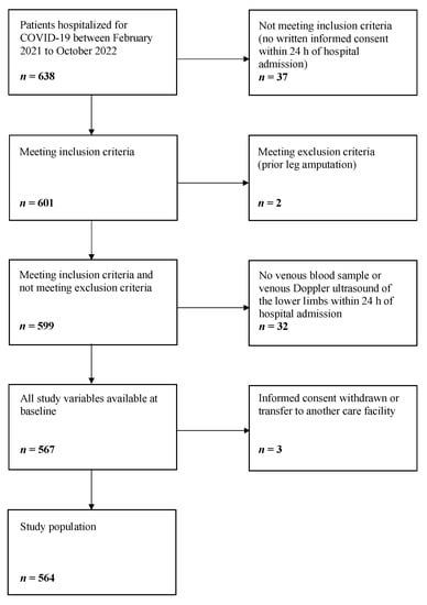 A cohort of patients admitted for COVID-19 to the internal medicine ward of the “Santa Maria della Misericordia” hospital of Perugia (Italy) from February 2021 to October 2022 was consecutively enrolled. The study protocol was developed in accordance with the principles of the Helsinki Declaration and approved by the local ethics committee. The inclusion criteria were as follows: (1) age ≥ 18 years; (2) a positive result on a real-time reverse transcriptase PCR (RT-PCR) assay testing for SARS-CoV-2 on nasal or pharyngeal swab specimens at hospital admission; and (3) written informed consent within 24 h of hospital admission. Previous lower-limb amputation was an exclusion criterion. At enrollment all patients underwent blood sampling for the assessment of Lp(a), biomarkers of thrombo-inflammation (i.e., D-dimer, C-reactive protein (CRP), procalcitonin, and white blood cell (WBC) count), and other routine laboratory parameters. In addition, all patients were screened for deep vein thrombosis (DVT) or superficial vein thrombosis (SVT) via venous Doppler ultrasound of the lower limbs. Afterwards, the overall clinical management followed currently available scientific recommendations and routine medical practice.
