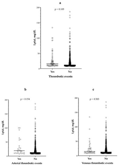 Lp(a) levels according to the occurrence of thrombotic events. (a) Lp(a) levels according to the occurrence of thrombotic events (arterial and venous thrombotic events combined). (b) Lp(a) levels according to the occurrence of arterial thrombotic events. (c) Lp(a) levels according to the occurrence of venous thrombotic events.