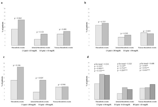 Rates of thrombotic events according to Lp(a) levels. (a) Rates of thrombotic events (either arterial and venous combined or separated) according to Lp(a) ≤ versus > the median value. (b) Rates of thrombotic events (either arterial and venous combined or separated) according to Lp(a) ≤ versus > 30 mg/dL. (c) Rates of thrombotic events (either arterial and venous combined or separated) according to Lp(a) ≤ versus > 50 mg/dL. (d) Rates of thrombotic events (either arterial and venous combined or separated) according to Lp(a) tertiles. * First versus second tertile; ** second versus third tertile; and *** first versus third tertile.