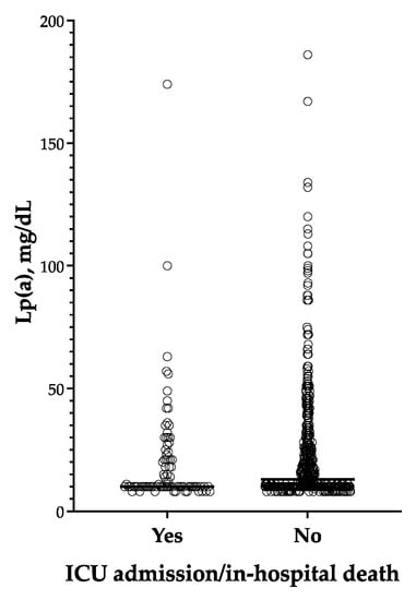 Only a few studies have investigated the association between circulating Lp(a) levels and different biomarkers of systemic inflammation and plasma thrombotic activity in the context of COVID-19, showing inconsistent results [,,,]. Additionally, data on the association between Lp(a) and either COVID-19 thrombotic complications or COVID-19 in-hospital outcomes are limited and contrasting [,,,,].