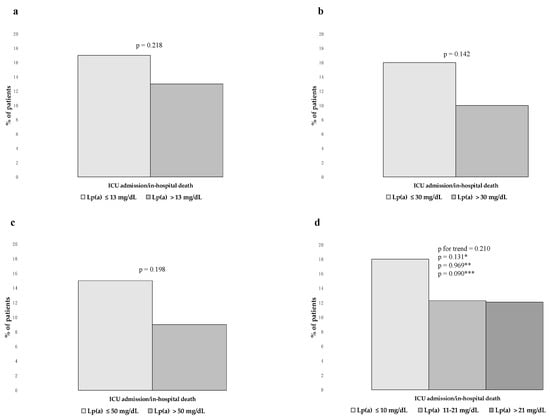 Rates of ICU admission/in-hospital death did not differ significantly according to Lp(a) ≤ versus > the median value, Lp(a) ≤ versus > 30 mg/dL, and Lp(a) ≤ versus > 50 mg/dL (Figure 5a–c). Additionally, they did not differ significantly across Lp(a) tertiles (Figure 5d). The HRs for ICU admission/in-hospital death according to Lp(a) levels are shown in Table 3.