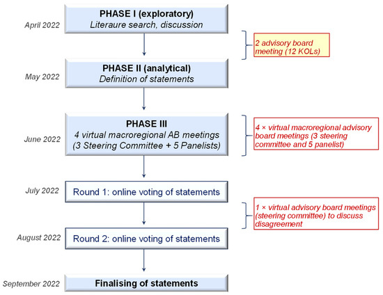 - Phase III: A series of 4 macro-regional virtual meetings were undertaken, each having the participation of 8 KOLs: 3 steering committee members and 5 panelists.