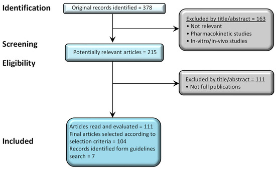 A flow diagram of the selection process for the literature search is shown in Figure 2. The initial search returned a total of 378 distinct results, a total of 163 records were excluded after reading the title, abstract, full text, or publications that were considered irrelevant or not clinical studies. A further 111 studies were excluded as they were not full publications according to our inclusion criteria. The remaining 104 articles were considered potentially relevant for further evaluation.
