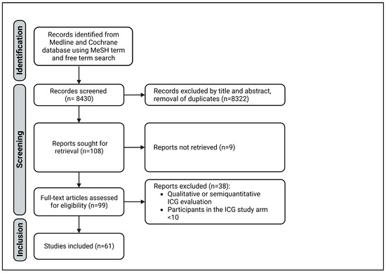 After identification, screening, and assessment for eligibility, 61 studies were included in this review. Although the PRISMA guidelines were followed, the reproducibility of results is limited by the steady increase of new articles in the emerging field of ICG imaging in general, visceral, and transplant surgery. Our results were last updated on 31 October 2022.