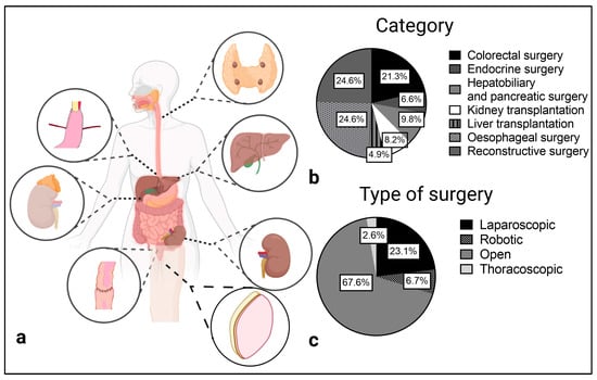 Surgical categories (a,b) and type of surgery (c) of the included studies.