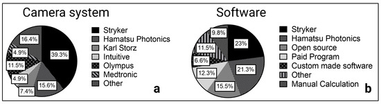The included studies showed the use of various camera systems. Stryker (Kalamazoo, MI, USA) was used in 24 studies and developed the SPY Elite system specifically for open surgery [9,26,28,39,49,50,51] and the PINPOINT camera system for minimally invasive surgery [15,33,44,52]. PINPOINT, with the developing manufacturer Novadaq (Seattle, WA, USA), was independent until 2017; therefore, Novadaq instead of Stryker can be found in reports up to 2017. In addition, Karl Storz (Tuttlingen, Germany) and Olympus (Tokyo, Japan) developed NIR camera systems mainly for minimally invasive surgery with IMAGE S1 [34,37,53,54,55] and Viscera Elite II, respectively. The photodynamic eye (PDE) camera system from Hamatsu Photonics (Shizuoka, Japan), the VisionSense (VS) iridium camera from Medtronic (Minneapolis, MN, USA), and the HyperEye Medical System (HEMS) from Mizuho Medical (Tokyo, Japan) are designed for open surgery. Of these, the PDE camera system was most frequently used in open surgery studies (n = 9). Robotic surgery was performed using the da Vinci surgical system with a Firefly NIR camera. Other manufacturers of the included NIR camera systems were OptoMedic Technology (Foshan, China), Fluoptics (Grenoble, France), Pulsion Medical Systems (Feldkirchen, Germany), and Beijing Aisery Medical (Bejing, China) (Figure 5).
