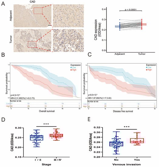 Preliminary verification of CAD signature in HCC. (A) Typical images of CAD immunohistochemistry in HCC and quantitative analysis of CAD expression. The images show a 16× magnification. Scale bar = 50 μm. (B) Relationship between CAD expression and OS. (C) Relationship between CAD expression and DFS. (D) Relationship between CAD expression in HCC histochemical microarray and pathological stage. (E) Relationship between CAD expression in HCC histochemical microarray and vascular invasion (*** p < 0.001). Abbreviations: Adjacent = adjacent noncancerous tissues; IOD = integrated optical density; HR = hazard ratio; OS = overall survival; DFS = disease free survival.