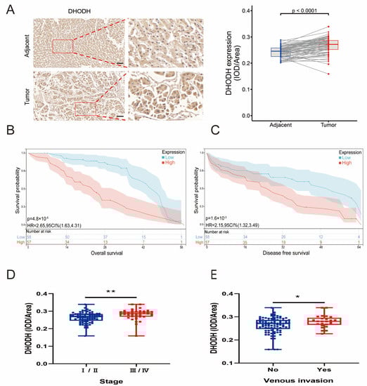 Preliminary verification of DHODH signature in HCC. (A) Typical images of DHODH immunohistochemistry in HCC patient tissueand quantitative analysis of DHODH expression. The images show a 16× magnification. Scale bar = 50 μm. (B) Relationship between DHODH expression and OS. (C) Relationship between DHODH expression and DFS. (D) Relationship between DHODH expression in HCC histochemical microarray and pathological stage. (E) The relationship between DHODH expression in HCC histochemical microarray and vascular invasion (* p < 0.05; ** p < 0.01). Abbreviations: Adjacent = adjacent noncancerous tissues; IOD = integrated optical density; HR = hazard ratio; OS = overall survival; DFS = disease free survival.