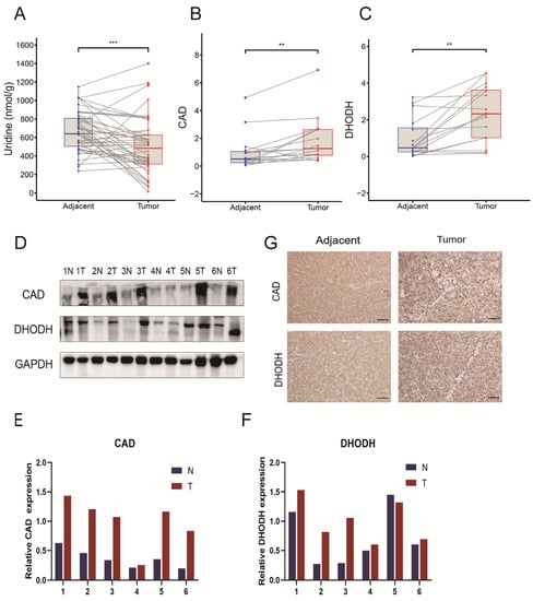 Uridine is a downstream metabolite of CAD and DHODH. To detect the downstream metabolite uridine, uridine levels in tumor tissues from patients with confirmed HCC (n = 46) and their matched adjacent liver tissues (n = 46) were also analyzed. The results showed that the median and interquartile ranges of uridine content in non−tumor and tumor tissues were 640.36 (504.45–807.43) and 484.22 (311.91–626.73) nmol/g, respectively. Notably, the uridine content in liver cancer tissues was significantly lower than that in non-tumor tissues. (Figure 3A). The clinical data from 46 HCC patients revealed a correlation between uridine levels and Child–Pugh Class, vascular invasion, and TNM stage (Table S3). Next, mRNA levels were examined in the tumors and their adjacent liver tissues of 16 randomly selected pairs of HCC patients. DHODH and CAD expressions appeared greater in tumor tissues compared to adjacent tissues of HCC patients and were statistically significant (Figure 3B,C). Similarly, a total of six pairs of HCC patients whose tumors and adjacent liver tissues were tested for protein levels, as well as representative images of histochemistry for DHODH and CAD, were selected, and elevated expressions of DHODH and CAD were observed (Figure 3D–G). These findings indicated a disturbance in uridine metabolism in HCC patients.