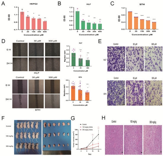 Inhibition of HCC cells’ development by uridine in vitro and in vivo. (A–C) Different uridine concentrations inhibited the proliferation ability of HEPG2, HLF, and 97H, as determined by CCK8 assay. (D) Inhibition of cell migration ability by uridine at 30 and 300 μm concentrations. Magnification, ×40. Scale bar: 200 μm. (E) Reduction of invasive ability of HCC cells by 30 and 300 μM concentrations of uridine. Magnification, ×200. Scale bar: 50 μm. (F) Images of nude mice bodies and tumor masses at day 16 after transplantation of 97H cells. (G) Tumor volume. (H) Representative HE images of subcutaneous tumors. Magnification, ×200. Scale bar: 50 μm (* p < 0.05; ** p < 0.01; *** p < 0.001).