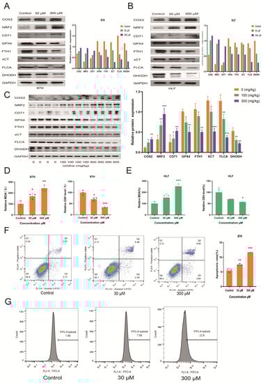 Inhibition of HCC cell development by in vitro uridine treatment via activation of the ferroptosis pathway. (A) Immunoblots of COX2, NRF2, CD71, GPX4, FTH1, xCT, FLCA, DHODH with control, 30, and 300 μM uridine concentrations in 97H cells. (B) Immunoblots of COX2, NRF2, CD71, GPX4, FTH1, xCT, FLCA, DHODH in HLF cells with control, 30, and 300 μM concentrations of uridine groups. (C) Immunoblots of COX2, NRF2, CD71, GPX4, FTH1, xCT, FLCA, DHODH in the subcutaneous tumor with control, 100 mg/kg, and 300 mg/kg concentrations of uridine groups after sampling in nude mice. (D) MDA and GSH contents with control, 30, and 300 μM uridine concentrations in 97H cells. (E) MDA and GSH contents in HLF cells with control, 30, and 300 μM uridine concentrations. (F) Apoptosis rate of 97H cells with control, 30, and 300 μM uridine concentrations. (G) ROS production with control, 30, and 300 μM uridine concentrations in 97H cells. (* p < 0.05; ** p < 0.01; *** p < 0.001).