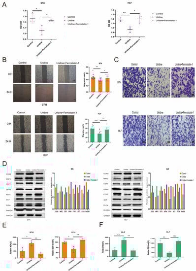 It was observed that the ferroptosis inhibitor Ferrostatin-1 blocked the effect of uridine in vitro. A total of three groups based on 97H and HLF cells were set up, which included the control group (DMSO only), uridine group (30 μM), and uridine with Ferrostatin-1 group (30 μM uridine, 1 μM Ferrostatin−1), respectively. The findings showed that the Ferrostatin-1 addition prominently reduced the uridine’s inhibitory action on the proliferation, migration, and invasion of HCC cells (Figure 6A–C). Ferroptosis-related proteins COX2, NRF2, and CD71 were downregulated, and GPX4, xCT, FTH1, and FLCA were upregulated in the uridine and Ferrostatin-1 groups compared to the uridine group and were not statistically different from the control group (Figure 6D). The changes in lipid peroxidation products MDA and endogenous antioxidant glutathione GSH were examined in both 97H and HLF cell lines after treatment with Ferrostatin-1, a ferroptosis inhibitor, and it was observed that MDA levels were downregulated and GSH levels were increased compared with the uridine group treatment (Figure 6E,F). The above results suggest that the ferroptosis inhibitor can alleviate the inhibitory effect of uridine on HCC cells in vitro.