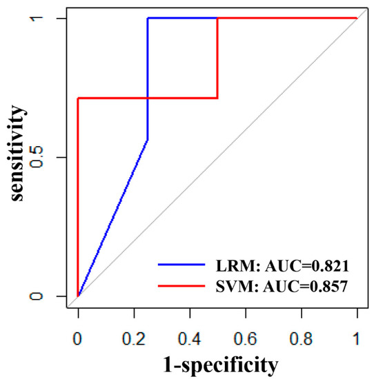 Sensitivity and specificity of LRM and SVM; blue indicates LRM with AUC = 0.821 and red indicates SVM with AUC = 0.857.