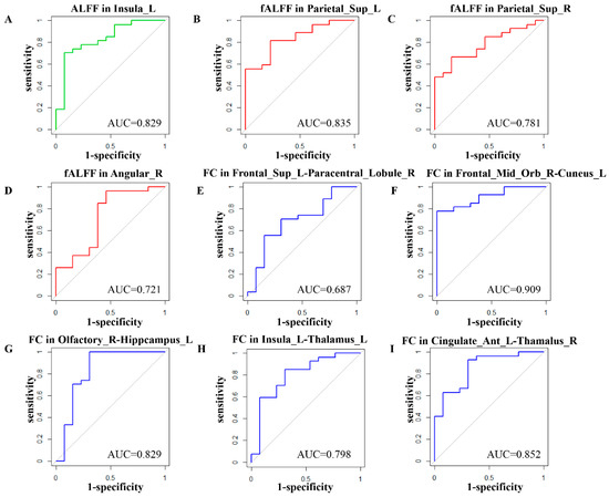 Prediction performance of nine brain regions, (A): AUC = 0.829 for ALFF of the INS.L; (B): AUC = 0.835 for fALFF of the SPG.L; (C): AUC = 0.781 for fALFF of the SPG.R; (D): AUC = 0.721 for fALFF of the ANG.R; (E): AUC = 0.687 for FC of SFGdor.L–PCL.R; (F): AUC = 0.909 for FC of ORBmid.R–CUN.L; (G): AUC = 0.829 for FC of OLF.R–HIP.L; (H): AUC = 0.798 for FC of INS.L–THA.L; (I): AUC = 0.852 for FC of ACG.L–HIP.R.