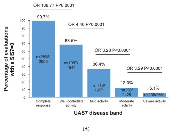Almost all UAS7 = 0 evaluations (99.7%) had SIS7 = 0 evaluations compared to only 68.5% of UAS7 = 1–6 evaluations (OR of UAS7 = 0 vs. UAS7 = 1–6 corresponding to SIS7 = 0: 136.77, 95% CI: 37.20–502.83; p < 0.0001; Figure 2A). The SIS7 approximately doubled between each subsequent increase in the UAS7 disease activity band, and the differences between the successive bands were significant (p < 0.0001). The LS mean total for the SIS7 in patients achieving UAS7 = 0 versus patients with UAS7 = 1–6 was 0.22 versus 0.95 (SE: 0.17; p < 0.0001; Figure 2B).