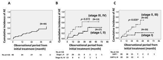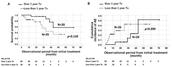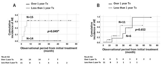 | Duration of initial treatment to AE (months) | 34.5 (24.3–41.0) | 13.5 (7.0–26.5) | <0.001 |