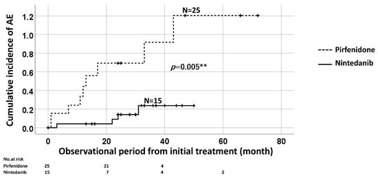 3.2.2. Cumulative Incidence Ratio of AE of IPF with Long-Term Antifibrotic Agent Use (>1 year) according to the Type of Antifibrotic Agent