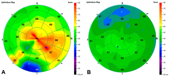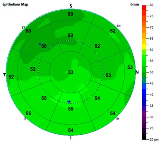 In the sectoral analysis, the median epithelial thickness was noticeably greater in the preoperative rather than the postoperative patients for all the sectors, except for the mid-peripheral inferior-temporal sector. The sectoral comparison of the postoperative eyes to the control eyes did not reveal any noticeable differences (Table 3).
