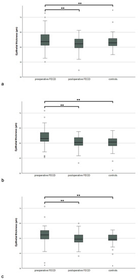 Furthermore, we did not differentiate the patients based on the severity of their FECD. The de-swelling effect of DMEK on the corneal epithelium might be less apparent in patients with early-stage FECD than patients with advanced FECD. Further studies investigating the effect of lamellar keratoplasties on the epithelial thickness in different disease stages are needed.