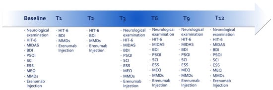The above-mentioned data were assessed at different times: baseline (T0) and every 3 months after the treatment start (T3, T6, T9, and T12). MMDs, DSMs, HIT-6, and BDI scores were evaluated every month after the treatment start for the first three months (T1, T2, and T3). Furthermore, a neurological examination was performed every 3 months (see Figure 1). Due to the multicenter nature of the study, we expected some of the collected data to be heterogeneous.