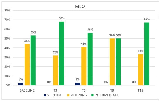 Patients did not report any known sleep disorders during medical history collection. Sleep was assessed at baseline (Table 2) and during quarterly follow ups in a subpopulation of 34 (39%) patients who underwent the 140 mg dosage. The baseline morning chronotype was shown in 44% of the population, an intermediate one in 53%, and an evening one in 3% of cases (Figure 2). A significant reduction of MEQ was observed between baseline and T3 (p < 0.05) from a morning chronotype in favor of an intermediate one (32% vs. 68%) (Figure 3). This variation was not confirmed in the successive follow ups.