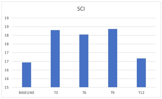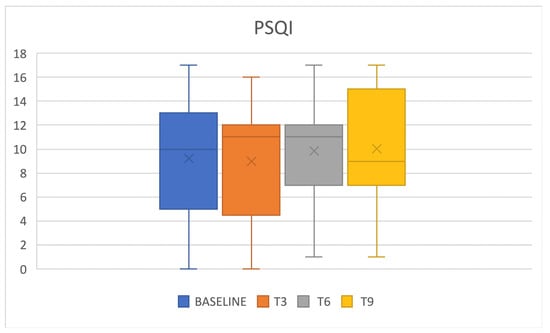 SCI score significantly increased at T3 compared to baseline (p = 0.0144) even if such an increase was not confirmed during later investigations (p > 0.05) (Figure 6). A SCI < 16, which correlates with insomnia, was present at baseline in 62% of patients (Table 2).