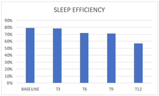 Regarding sleep quality, a PSQI score > 5 (poor sleep quality) was present at baseline in 64% of patients and did not vary significantly at follow up (Figure 4). Sleep efficiency (i.e., the ratio between the hours spent sleeping and the ones spent in bed) showed a slight reduction trend, without reaching statistical significance (Figure 5).