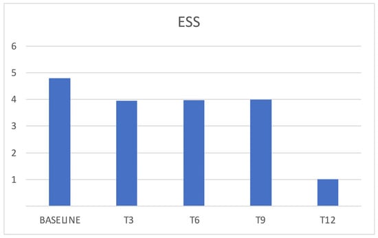 ESS score showed a slight reduction during follow ups without reaching a statistical significance (Figure 7). An ESS > 10 was present in 15% of patients at baseline.