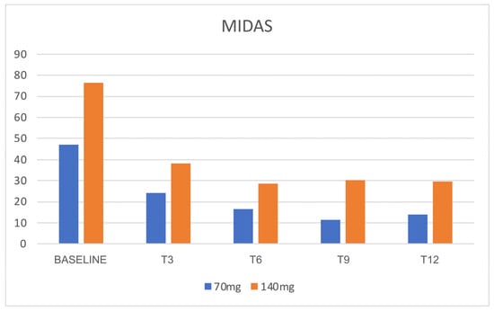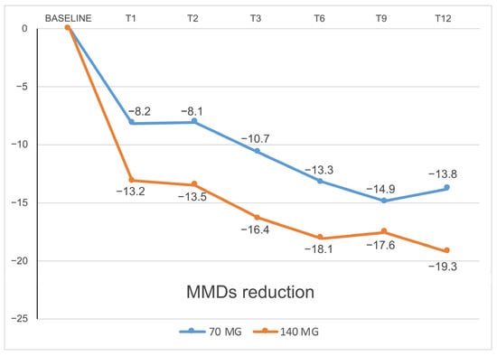 At T3, we recorded a statistically significant reduction in MMDs compared to baseline: from 21.62 ± 5.10 to 10.94 ± 7.87 in patients receiving 70 mg (p < 0.001) and from 25.71 ± 5.67 to 9.32 ± 8.75 in those taking 140 mg (p < 0.001). Efficacy was maintained in patients who continued treatment after 6, 9, and 12 months. In particular, for patients with the 70 mg dosage, T6 = 8.84 ± 5.95, T9 = 6.72 ± 5.19, and T12 = 8.02 ± 4.24; regarding the different timing comparison, statistical significance was reached for every timing vs. T0 (p < 0.001). Moreover, there was a significant difference between T3 and T9 (p = 0.014) that was not confirmed in T3 vs. T12 (p = 0.766); the other comparisons among the MMDs of T3, T6, T9, and T12 were not statistically significant. As far as the 140 mg dosage was concerned, we obtained: T6 = 7.74 ± 6.87, T9 = 8.21 ± 6.64, and T12 = 10.25 ± 6.70. Even here, efficacy among every timing was confirmed vs. T0 (p < 0.001); with such a dosage, no significant difference was observed among T3, T6, T9, and T12. (Figure 8). Efficacy rates, as well as percentage reduction in MMDs, are shown in Figure 9.