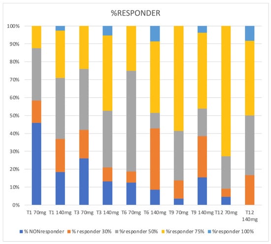 Percentage of responders, 70 mg vs. 140 mg. Note that there is no T12 evaluation responders’ rate for 70 mg dosage since only 140 mg patients reached this follow-up time.