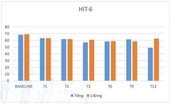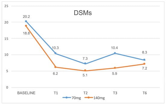 Moreover, the efficacy of the two dosages and the response time were compared. After the first dose of 70 and 140 mg (T1), 13% and 18% of patients showed a 30% response in terms of MMD reduction, respectively, compared to baseline; 29% and 34% had a 50% response, 13% and 26% had a 75% response, and 0% and 3% had a 100% response, respectively. These percentages increased from month to month, as shown in Figure 8. The dosage of 140 mg initially proved to be more effective than the 70 mg one in reducing MMDs after just the first month (p = 0.00410) and up to the sixth month (p = 0.00485), then the efficacy became progressively comparable (Figure 2 and Figure 3). No significant differences were found between the two dosages regarding DSMs (p > 0.05) (Figure 10).