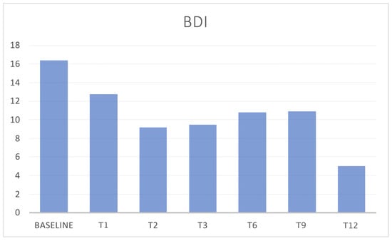 During the treatment with both dosages of 70 and 140 mg, patients referred to a minor impact of headache in everyday life, with a concomitant reduction in migraine-associated disability, as shown by the significant reduction in MIDAS and HIT-6 scores during all the evaluations compared to baseline (p < 0.05) (Figure 11 and Figure 12). Even the depression-associated symptoms improved, as demonstrated by a reduction in the BDI scores that was reported in a subpopulation of 45 patients treated with 140 mg erenumab (Figure 13).