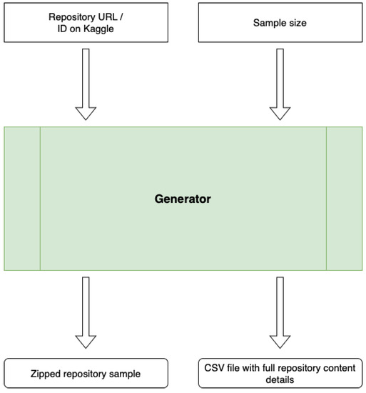 As an input, the generator takes the sample size, the repository URL, the data output file path, the temporary full data path, the repository sample output path, the repository type, and the output CSV file path.