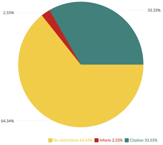 Out of the 127 datasets, the authors of 3 of them provided a note about the need to inform them about the obtained results. Authors of 44 datasets provided information about the need to cite the indicated works using the provided data and publishing the results. Over two-thirds, or 80 datasets, had no restrictions on use. Figure 3 shows the full breakdown of the legality of using data contained in the datasets.