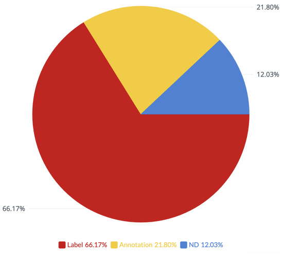 Breakdown of the image descriptions. Label = manually assigned labels corresponding to diagnosed ocular diseases, image quality or described areas of interest, Annotation = manual annotations on images indicating areas of interest, ND = no descriptions.