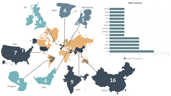 Khan et al.’s [11] work includes 54 repositories of color fundus photos. At the time of writing this article, only 47 were available. In this work, we have added 73 repositories of color fundus photos, samples of the content of each of them (https://shorturl.at/hmyz3; accessed on 16 May 2023), a tool for automatic content inspection of current or future repositories, accurate access type information (form/registration/e-mail to the authors/no difficulties), degree of difficulty of access to the repository, total file size, image sizes, photo descriptions, information about additional artifacts and legality of use, along with any required papers to be cited.