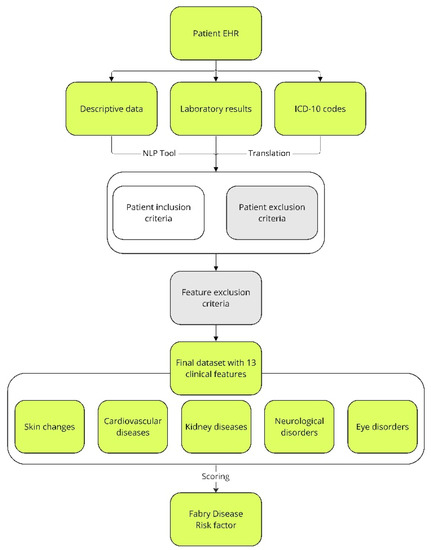Fabry disease (FD) is an ultra-rare genetic disorder with an incidence of 1:40,000 to 1:117,000, depending on the studied population [1]. It is caused by pathological variants of the alpha-galactosidase A gene (GLA) encoding lysosomal enzyme alpha-galactosidase A [2]. Lower activity of that enzyme leads to pathological accumulation of glycosphingolipids, such as globotriaosylceramides inside lysosomes, followed by cell degeneration, tissue inflammation, and organ impairment [3]. Since FD is an X-linked disorder, the symptoms are usually more severe in males than in females [4,5]. Interestingly, screening studies have revealed that the frequency of GLA pathological variants in newborns is much higher than the prevalence of clinically significant FD cases [6,7]. This phenomenon is likely a result of the complex gene expression profile or post-transcriptional modifications opposing the clinical role of the genetic GLA abnormalities [8,9,10]. Usually, the first clinical symptoms of FD appear early, during the preschool or school periods [11]. They include neuropathic pain (e.g., acroparesthesias), with the so-called “pain crises”, gastrointestinal symptoms, impaired sweating, and cold/heat intolerance. Other characteristic FD traits include recurrent fever, typical skin changes (e.g., angiokeratoma), ophthalmologic (e.g., cornea verticillata) and otolaryngological (e.g., hearing impairment or loss, dizziness) abnormalities, while those most frequently responsible for shortening the patient’s life include cardiac dysfunction, cardiovascular and cerebrovascular events, and chronic kidney disease, usually with proteinuria [12,13]. Despite many symptoms, diagnosis of FD in relation to the appearance of the first symptoms is usually significantly delayed (by 7–10 years), because most of the symptoms are non-specific [14,15,16]. Furthermore, awareness about this disease in the medical community is low [16,17]. It has been shown that 43% of pediatricians and 70% of rheumatologists could not point to the proper diagnostic approach in FD suspicion [16]. On the other hand, since effective therapy exists [18], early diagnosis is critical to limit disease progression; however, damage done to the organs prior to its initiation cannot be reversed [19,20,21]. Automatization of the screening process, based on approaches evaluating medical file records for suspicion of FD trait, might facilitate and shorten the time to diagnosis, benefiting patients and their physicians. Several applications have been described in the literature based on artificial intelligence (AI) or related methods for identifying rare diseases. For example, Hughes et al. [22] presented an approach helping to determine the severity of FD using an expert algorithm based on symptoms and clinical findings. Jefferies et al. [23] described an AI tool (OM1 Patient Finder™, OM1 Inc., Boston, MA, USA) capable of identifying patients at high FD risk. They proved the tool to be effective, with an AUC of 0.82. Access to large-scale databases of EHRs presents new opportunities to apply NLP methods and new sources of clinically valuable knowledge. One of the text processing tasks is the recognition of entities, especially in the medicine domain entities like symptoms or signs of certain conditions in general. Today’s implementations of NLP on unstructured narrative texts from EHRs have shown promising results on this task [24]. There is an increasing interest in BERT-like transformers [25,26]. Rule-based approaches have also been shown to be effective [24,27,28,29]. However, we decided to use a lexicon-based approach similar to that used by Oladapo Oyebode [29], but instead of the sentiment score, we used sentence embedding, implemented in spaCy [30], and cosine similarity to measure the level of similarity to achieve a complete automated process of extracting data from electronic health records (EHRs). It is important to note that medical description accounts for a substantial part of EHRs, and in many cases the majority of the information is in the form of unstructured data; therefore, NLP-based methods may be more sensitive than approaches based on ICD-9- or ICD-10-derived clinical phenotypes or on laboratory test results alone. Our study aimed to develop and test a risk-factor-based scoring system to support physicians in early diagnosis of FD through automatic screening and analysis of EHRs available in the information systems of primary care and outpatient clinics in real life with the use of NLP. Specific rare disease indication is much more efficient when a patient’s description is mapped against thousands of other records. In addition, tremendous amounts of complicated patient background information—i.e., the complete documentation of the patient’s medical history, which facilitates diagnosis—cannot be evaluated by a physician during one visit, in contrast to the presented approach. We believe that the NLP-based approach presented in this paper could accelerate accurate diagnosis among patients with signs of FD.