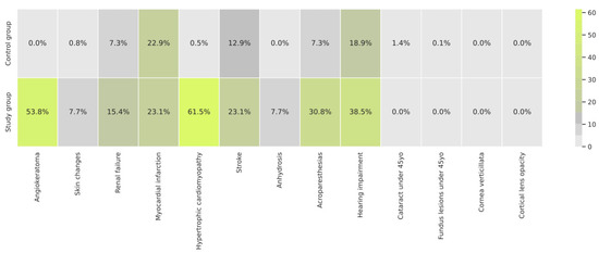 This study presents a detailed NLP-based analysis of the EHRs of 19,385 patients. Their general characteristics and five most common FD signs are shown in Table 1. According to the obtained results, the prevalence of Fabry was higher among males than females (by 11.5%). The number of females and males was equal in the control group (within an accuracy of 1%). The statistical test failed to reveal any significant difference in terms of gender distribution between the study and control groups. Hence, there is not enough evidence to confirm a gender predisposition based on the observed differences among FD patients. In other words, patients are likely to have random chances rather than gender predisposition. On the other hand, the statistical test revealed a significant difference in mean age between the two groups, with FD patients being younger than patients in the control group. The results of the other tests showed that the distribution of traits differed significantly between both groups. As no eye disorders were observed in the study group, we excluded this sign from hypothesis testing. It was found that the most frequent sign in both the study and control groups was cardiovascular disease (Table 1) with the following clinical feature: hypertrophic.