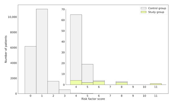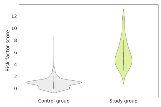 Risk factor distributions in the control group and the study group. The mean risk factors in the study group and the control group were 5.7 (SD 2.13) and 0.8 (SD 0.72), respectively. SD—standard deviation.